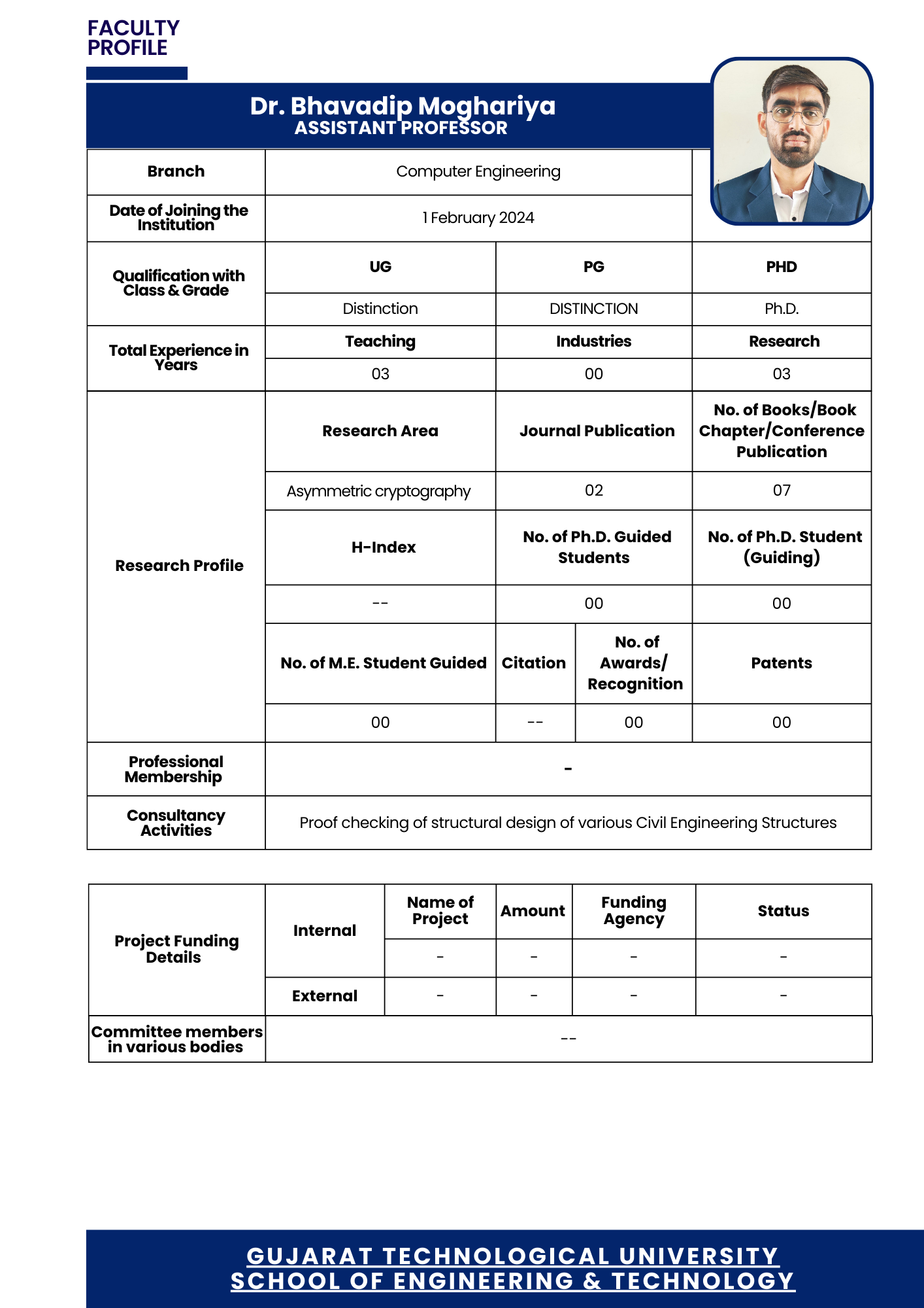 He holds a Diploma in Electronics and Communication Engineering (2014) from Balaji Institute of Engineering and Technology, a Bachelor’s degree in Electronics and Communication Engineering (2020) from Marwadi Education Foundation’s Group of Institutions, and a Master’s degree in Electronics and Communication Engineering with a specialization in Mobile Communication and Network Technology (MCNT) (2023) from GTU – Graduate School of Engineering and Technology. Currently pursuing his PhD, his research focuses on Wireless Networks, with particular interest in Vehicular Ad hoc Networks (VANETs) and their optimization
